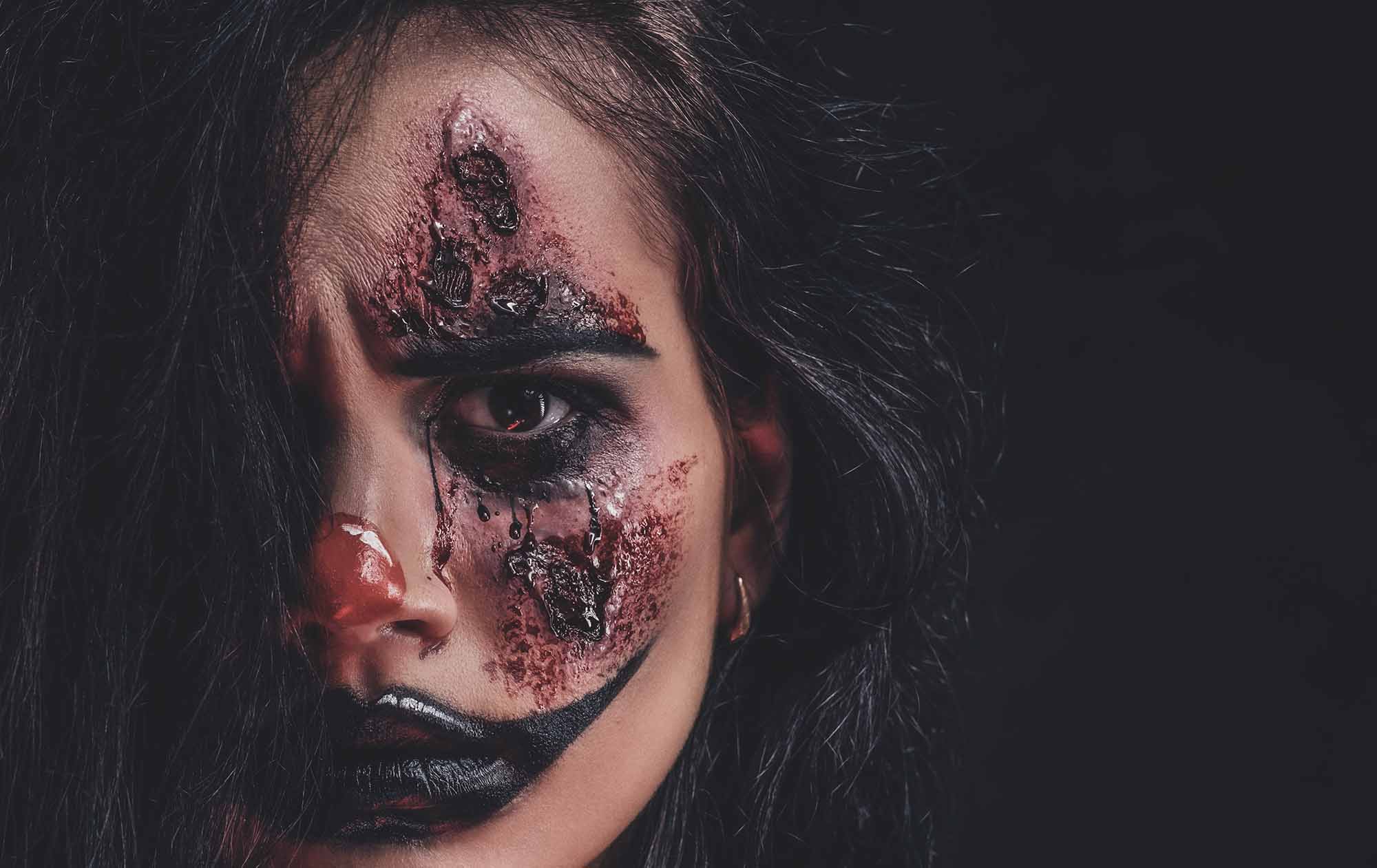 Creepy Halloween evil clown with red light and big exposition, creating movement effect.